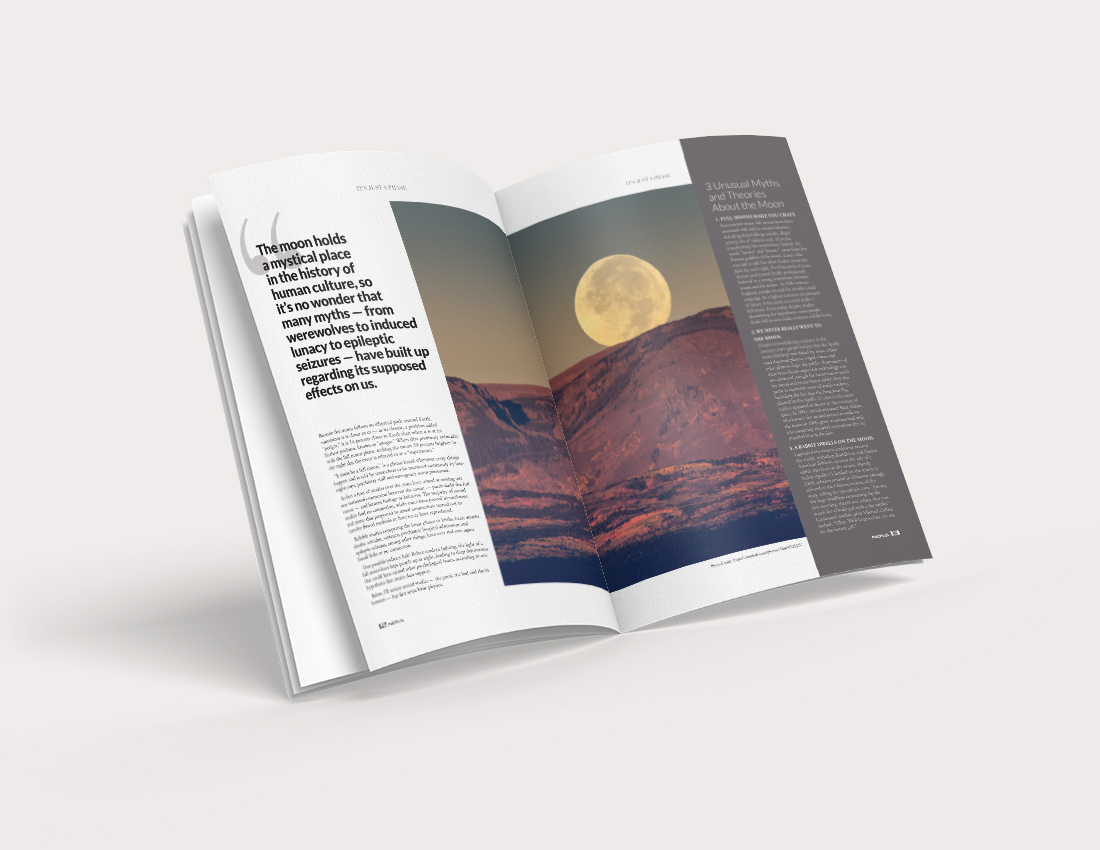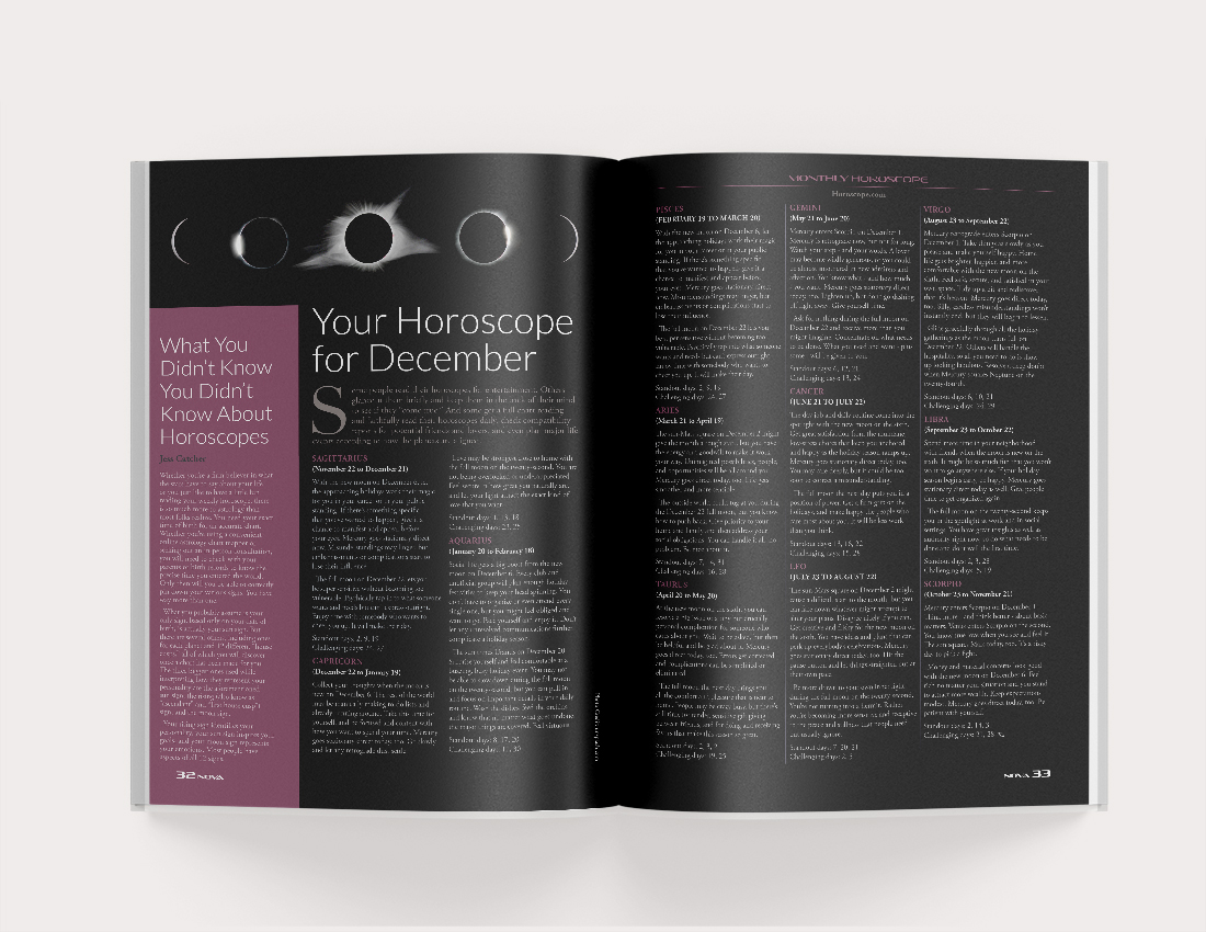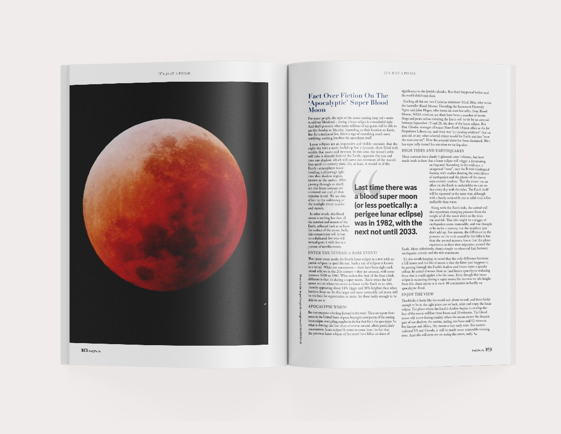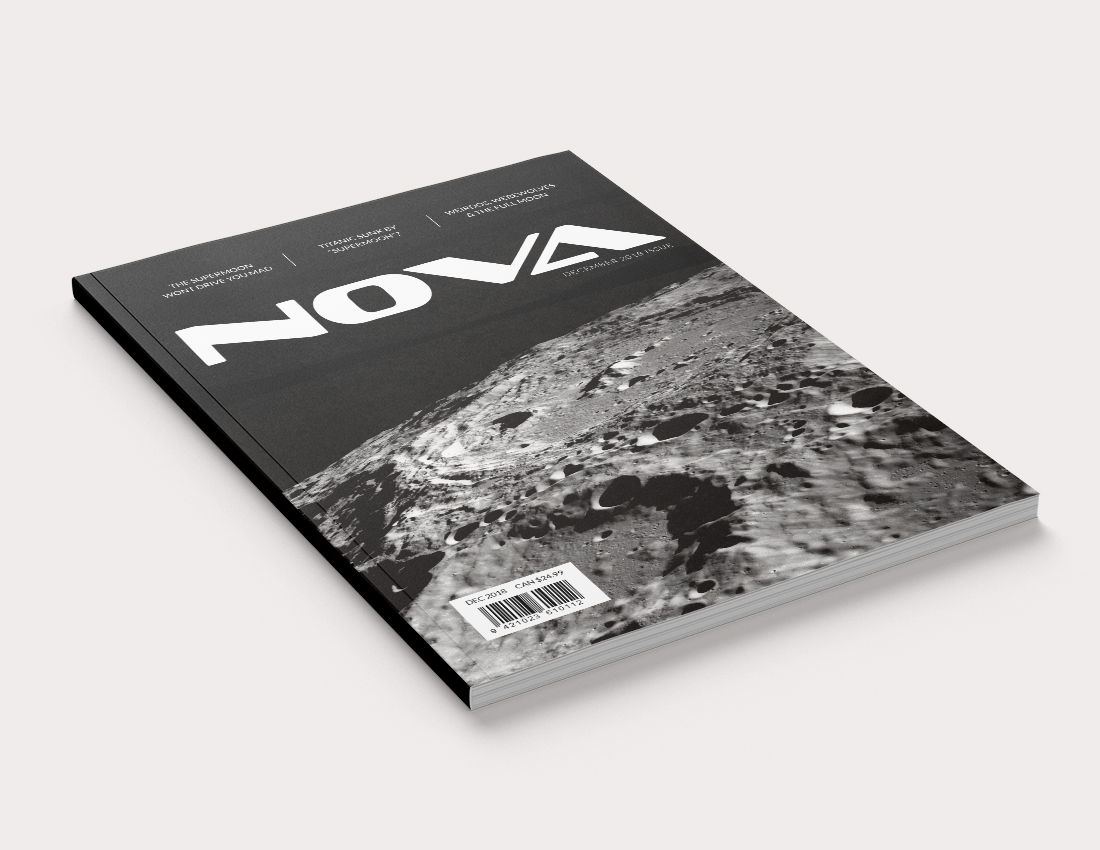 Nova is a fictional astronomy magazine for young adults who have a general interest in the topic but who may not have in-depth knowledge on the subject. While most information given about space is done so in an ‘out of this world’ style, Nova looks to deliver its information in a ‘down to earth’ and relatable manor for the average person to enjoy.  Large and bold imagery is use to catch the eye of the reader and is paired with a clean text layout. The overall feel of the magazine is meant to give readers a relaxing and enjoyable trip into space.