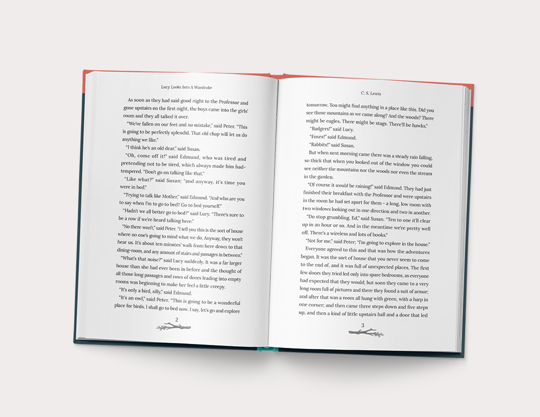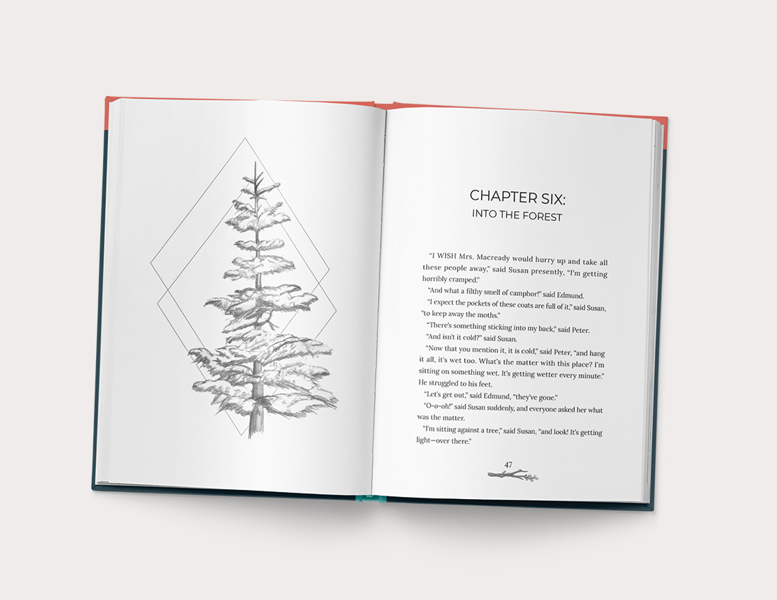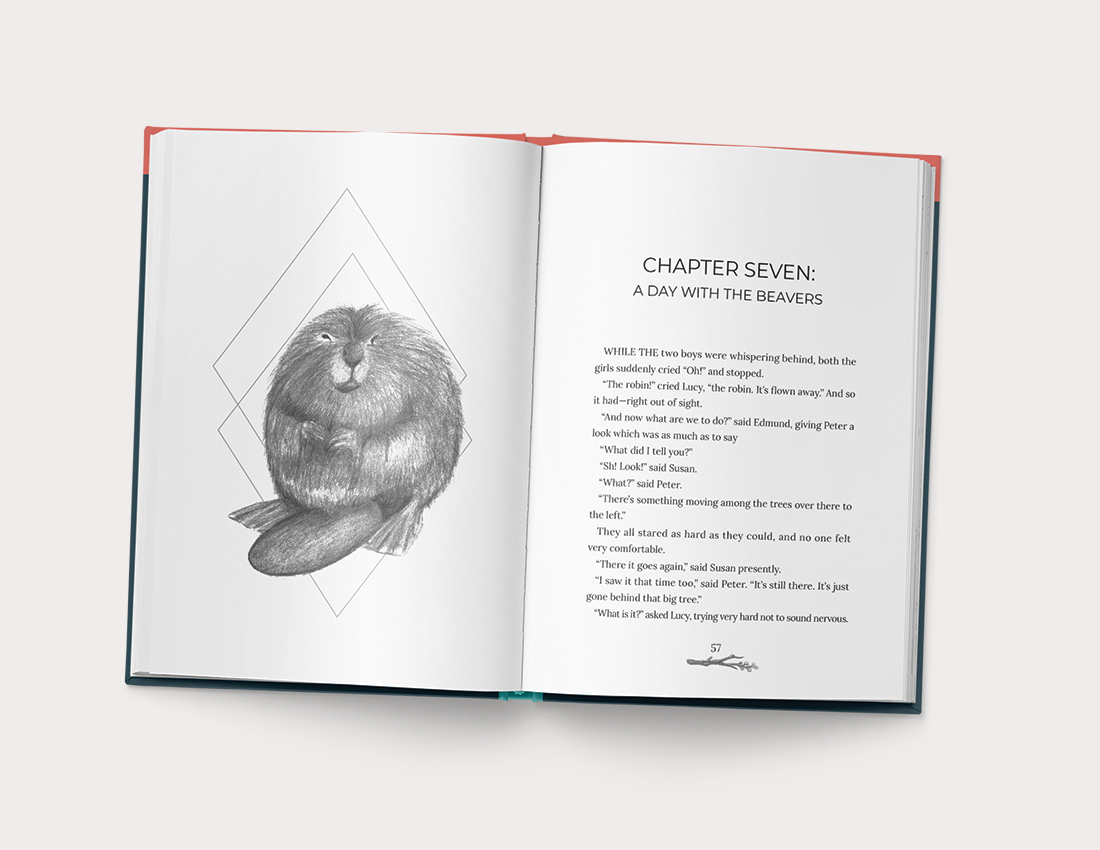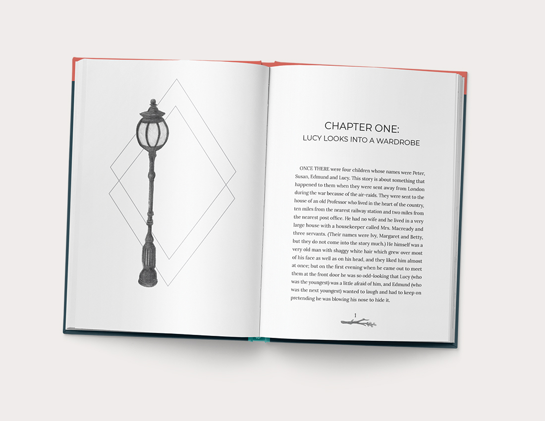 The Lion, the Witch, and the Wardrobe is a children’s book that engages readers of all ages within a world of magic, adventure and fantasy. A re-design done for this book looked to emanate these characteristics within its pages. The type was laid out in a clear and easy to read manor to ensure that readers of all age-groups could easily engage with the story. The original illustrations created that begin each chapter are done in a simplistic sketch-style that helps to excite the reader for the next phase of the book while still letting the reader’s own imagination remain in control. The cover uses a similar style of illustration with a pop of bold colours to help draw the eye of younger readers and to add a sense of fun and excited to the overall feel. A handwritten font was chosen to pair with the sketch style of the illustration to further this sense of fun and wonder.