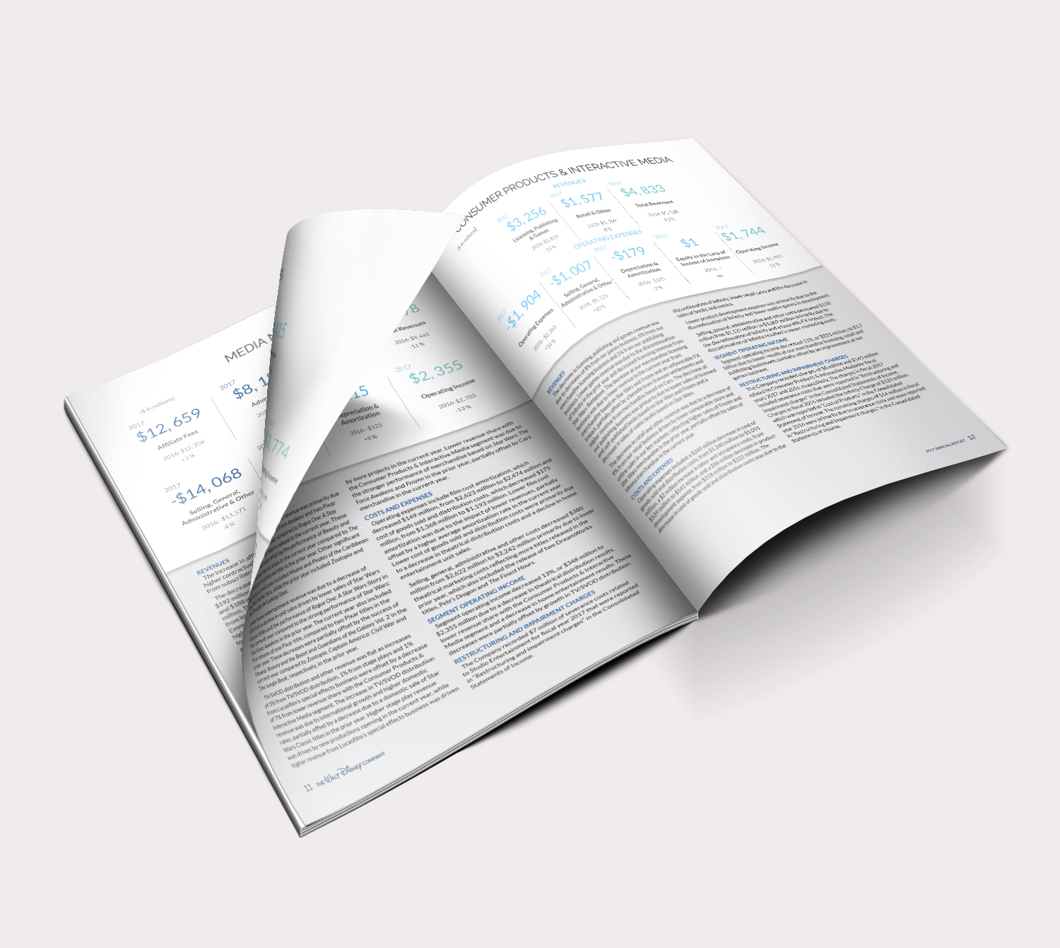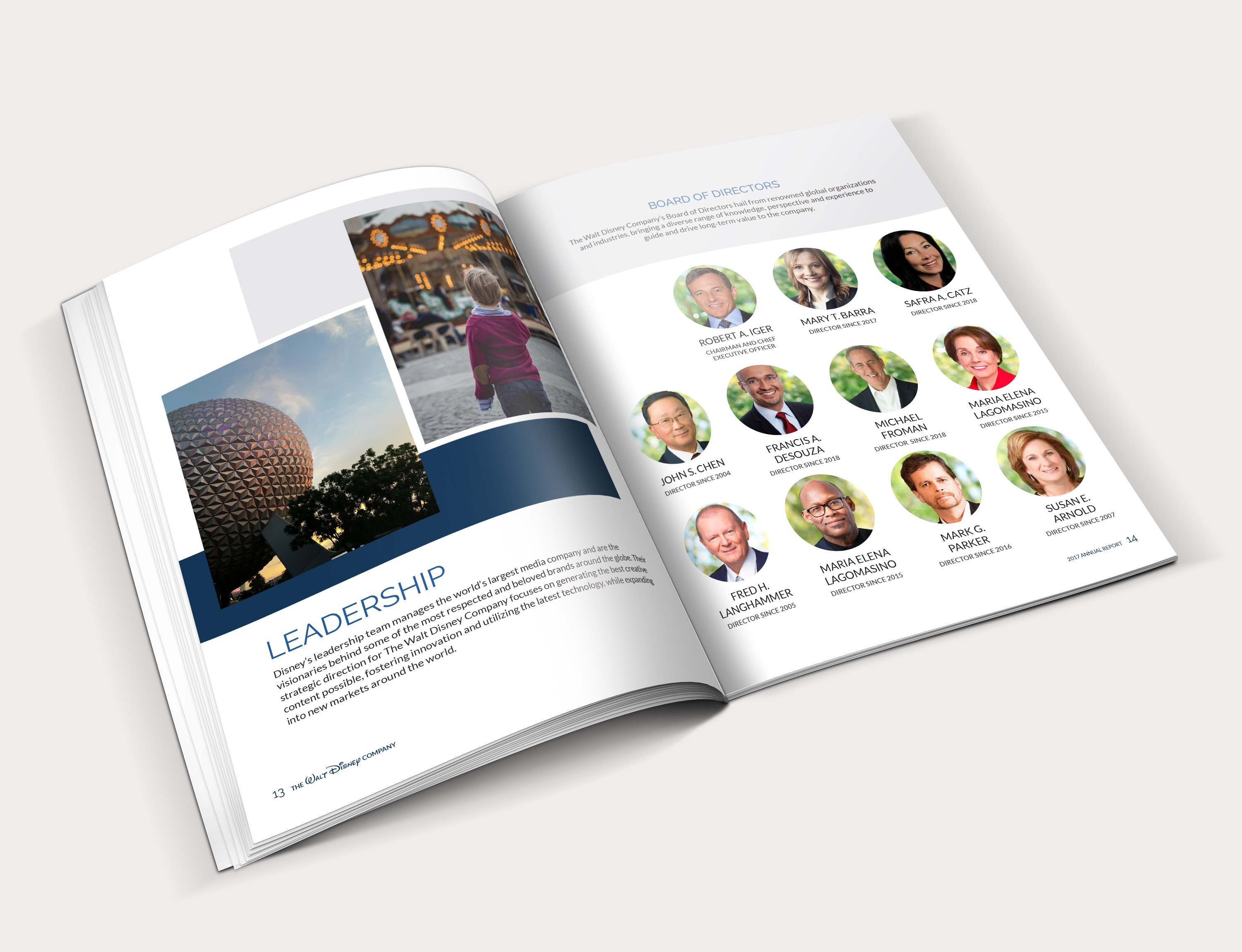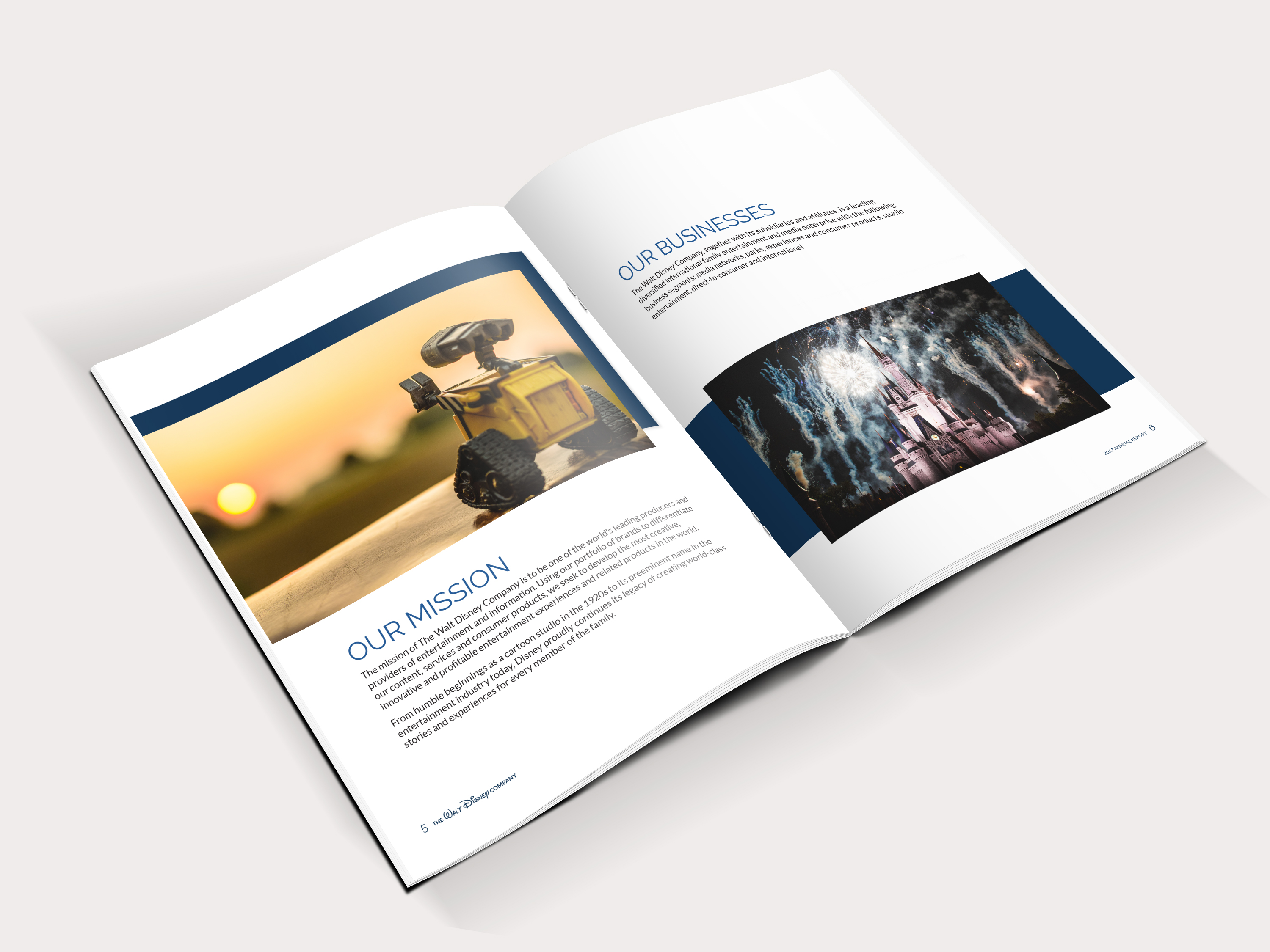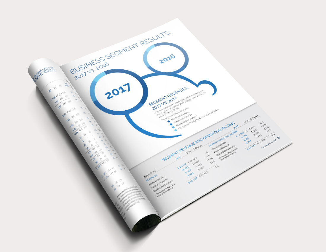 This is a re-design I did of the 2017 Annual Report for The Walt Disney Company featuring original graphics. I took the information presented within the report and laid it out in a way that is clear and visually interesting for the reader. I used charts and graphs to help highlight key information within the report and the cover image is an original graphic created of the Walt Disney Epcot Theme Park’s Spaceship Earth Geosphere.